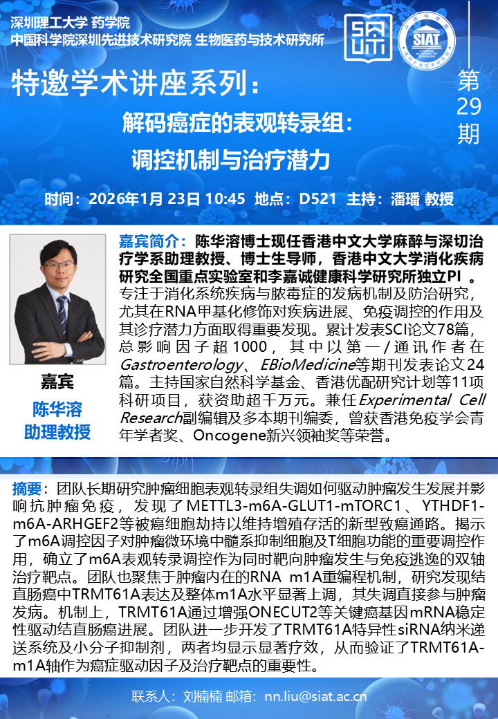 大家好!药学院/医药所“特邀学术讲座系列”第29期将于2026年1月23日(周五)10:45,在先进院D521会议室举行。本期讲座特邀香港中文大学的陈华溶 助理教授,带来题为“解码癌症的表观转录组:调控机制与治疗潜力”的报告。届时,潘璠 教授将主持讲座。