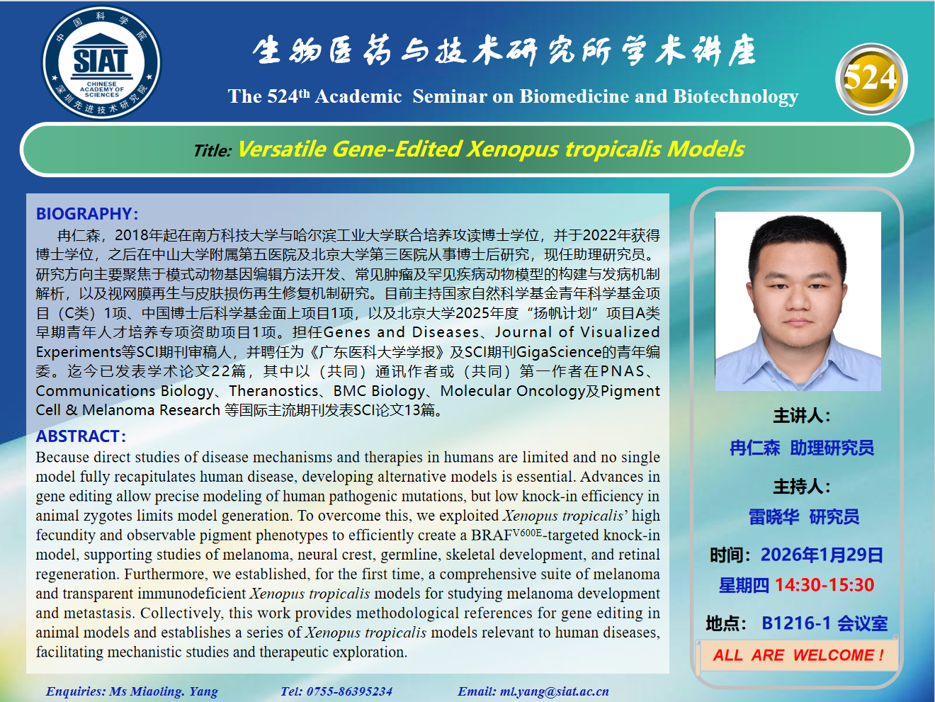 大家好! 医药所第524期学术讲座将于2026年1月29日 星期四 14:30-15:30 B1216-1大会议室举行。本次讲座邀请了来自中山大学附属第五医院 冉仁森 助理研究员带来“Versatile Gene-Edited Xenopus tropicalis Models”的报告。届时,雷晓华 研究员将主持讲座。