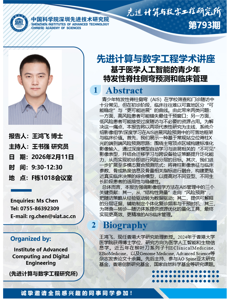 大家好!数字所/计算机学院第793期学术讲座将于2月11日09:30-12:30在F1018会议室举行,本次讲座将邀请香港大学 王鸿飞 研究助理教授作题为“基于医学人工智能的青少年特发性脊柱侧弯预测和临床管理”的报告。本次报告将由数字所 王书强 研究员主持,诚挚邀请大家参加、学习和交流!