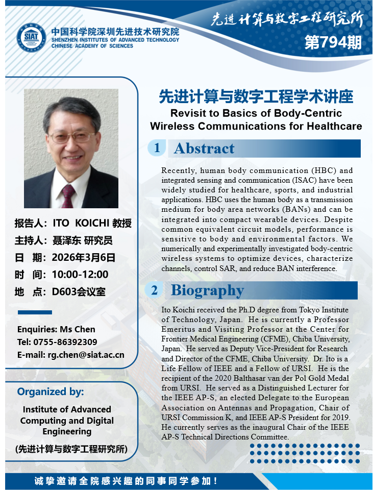 大家好!数字所/计算机学院第794期学术讲座将于3月6日10:00-12:00在D603会议室举行,本次讲座将邀请Chiba University(日本千叶大学) ITO KOICHI 教授作题为“Revisit to Basics of Body-Centric Wireless Communications for Healthcare”的报告。