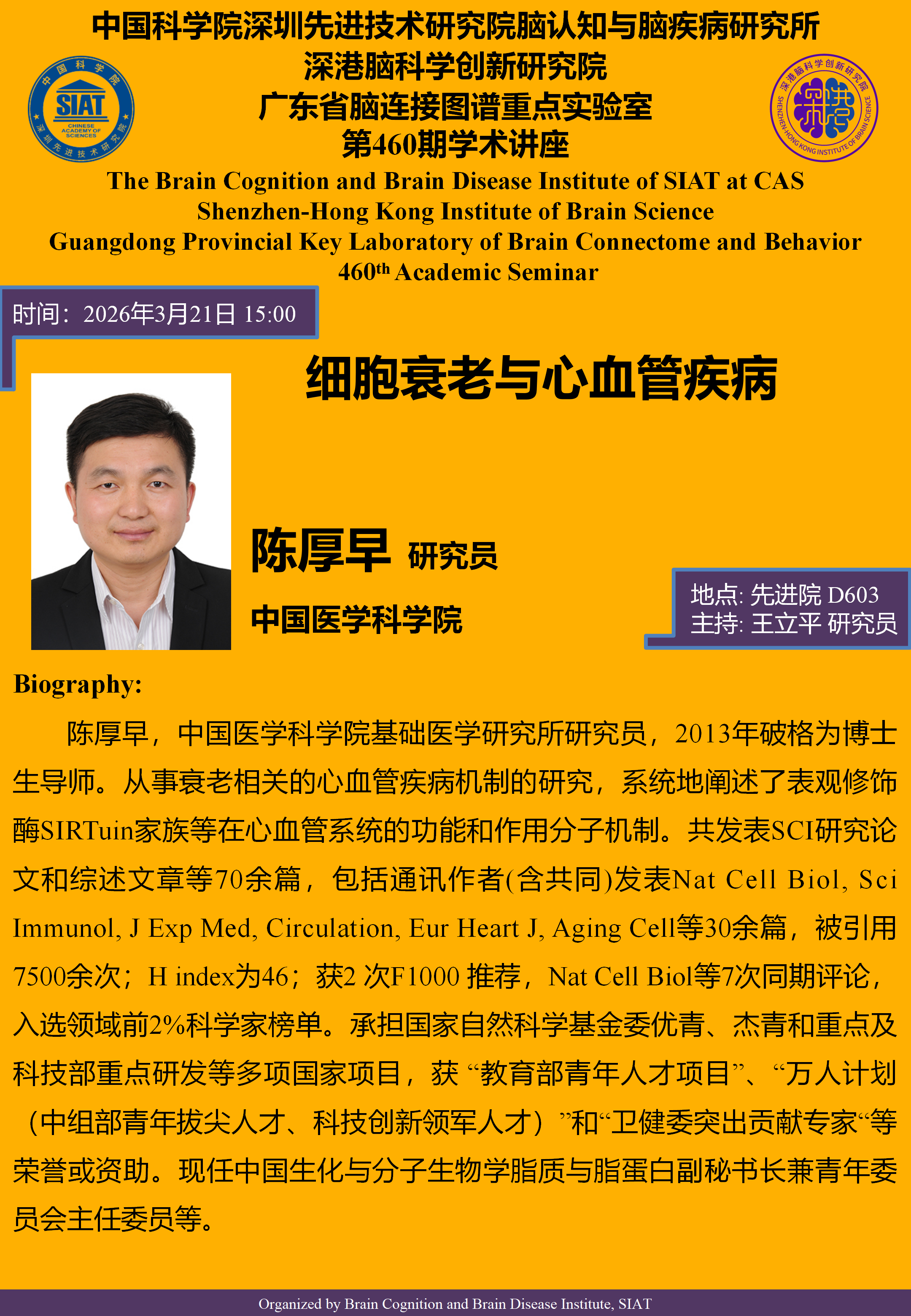 各位老师,同学: 大家好!脑所/深港脑院将于3月21日(星期六) 15:00,地点:先进院D603会议室 举办第460期学术讲座。本次讲座邀请到中国医学科学院 陈厚早研究员,带来题为“细胞衰老与心血管疾病”的报告。