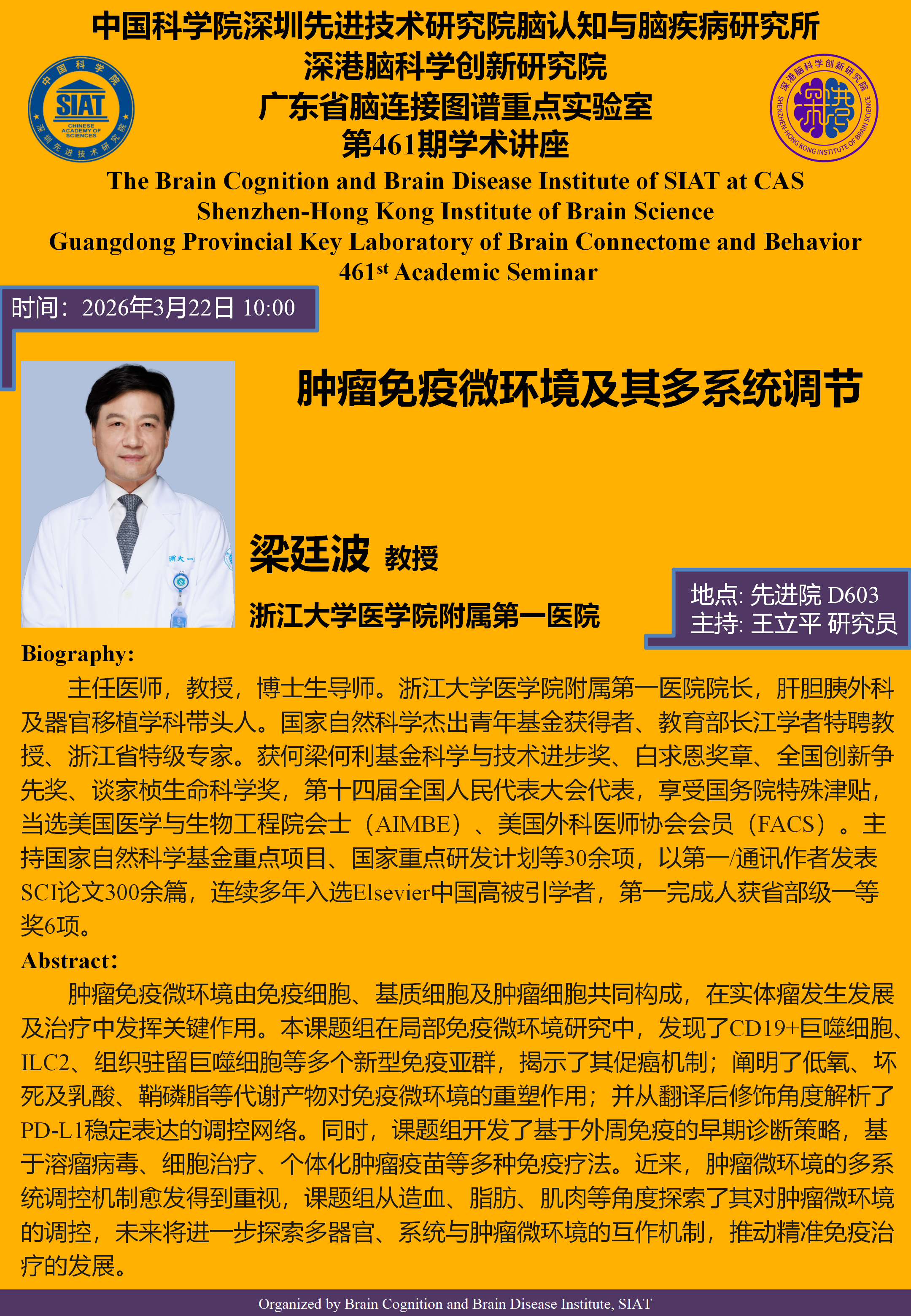 大家好!脑所/深港脑院将于3月22日(星期日) 10:00,地点:先进院D603会议室 举办第461期学术讲座。本次讲座邀请到浙江大学医学院附属第一医院 梁廷波教授,带来题为“肿瘤免疫微环境及其多系统调节”的报告。