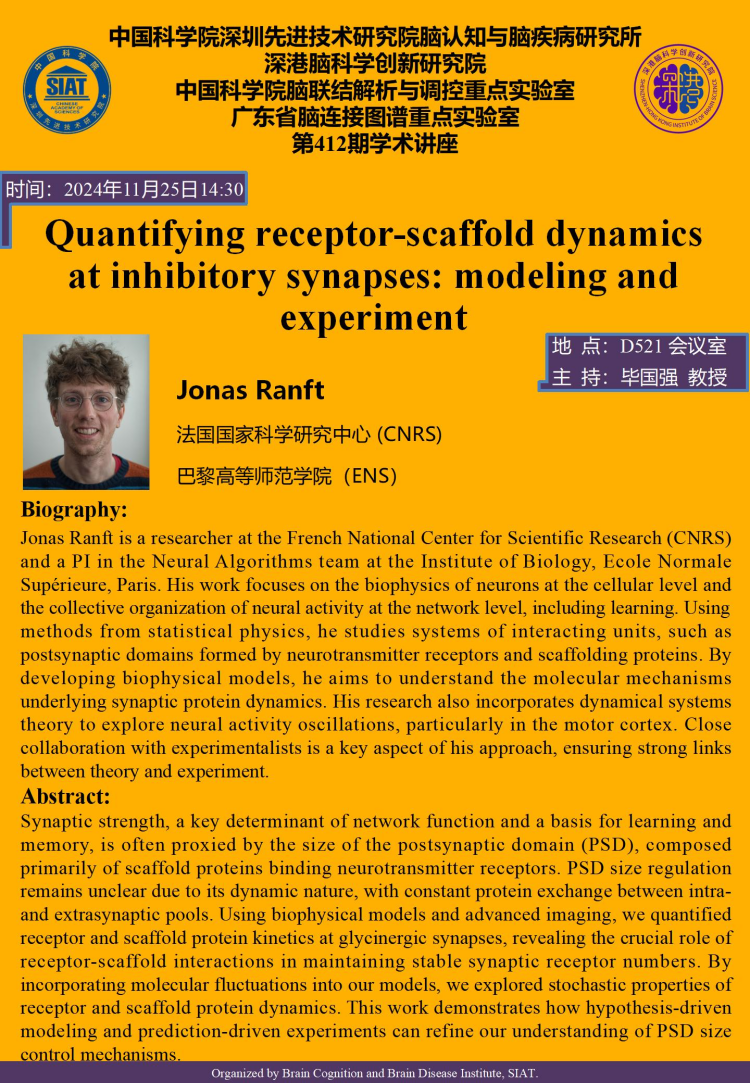 【2024年11月25日 脑所/深港脑院】Quantifying receptor-scaffold dynamics at inhibitory synapses: modeling and experiment