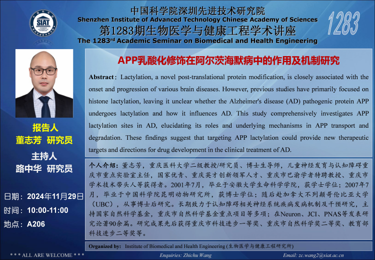【2024年11月29日 医工所】APP乳酸化修饰在阿尔茨海默病中的作用及机制研究