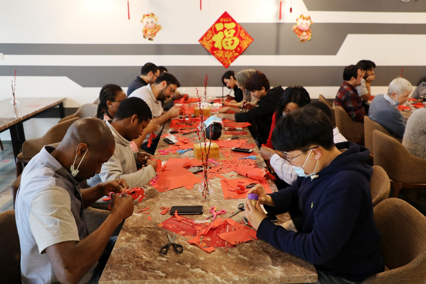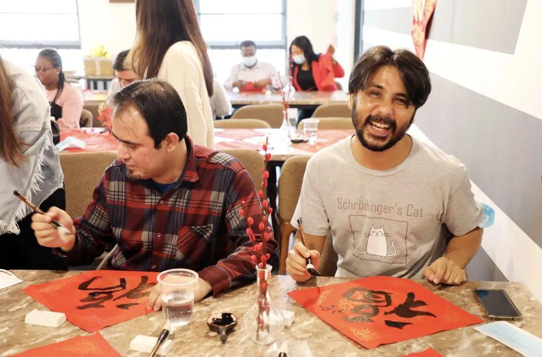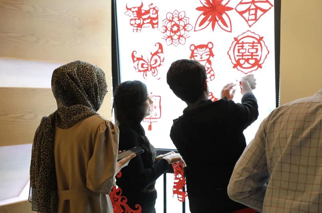 国际专家和留学生们交流了各国迎接新年的习俗,回顾了过去一年中的收获与成绩,还一起体验了中国传统迎新春习俗——“剪窗花”与“写福字”。大家纷纷动起手剪出了春、福牛、灯笼、大阿福等传统图案,写出了一个个或饱满或劲瘦的“福”字。