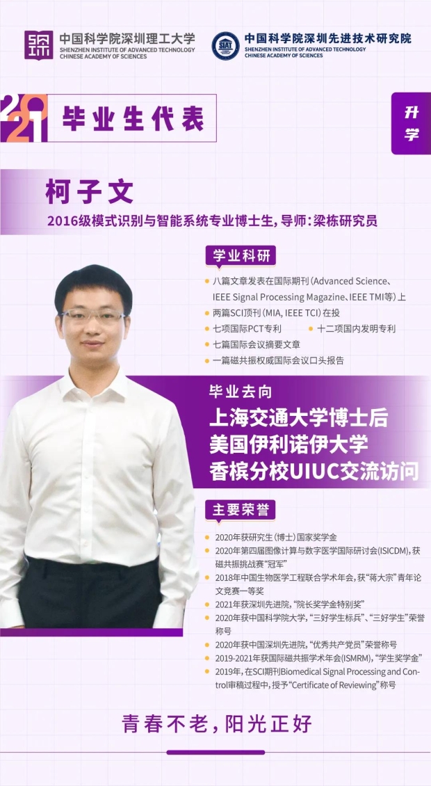 柯子文,医工所医学人工智能研究中心,博士,师从梁栋研究员,研究方法是医学人工智能,已发表学术期刊及会议论文16篇,申请发明专利19项,毕业后将去上海交通大学做博士后,伊利诺伊香槟分校UIUC访问交流。