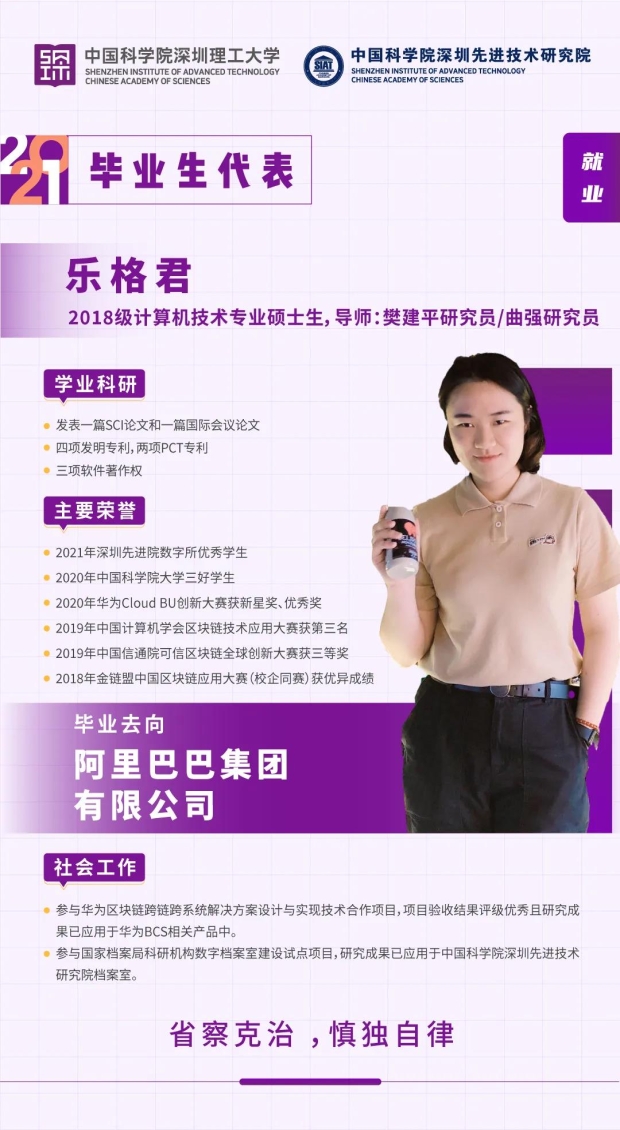 乐格君,先进计算与数字工程研究所高性能数据挖掘重点实验室的硕士生,师从樊建平研究员和曲强研究员,主要研究方向是区块链技术,主要获得的学术成果有一篇SCI论文和一篇国际会议论文,申请了四项发明专利和两项PCT专利;曾参与华为区块链跨链跨系统解决方案设计与实现技术合作项目,项目验收结果评级优秀且研究成果已应用于华为BCS相关产品中;参与国家档案局科研机构数字档案室建设试点项目,研究成果已应用于深圳先进院档案室。