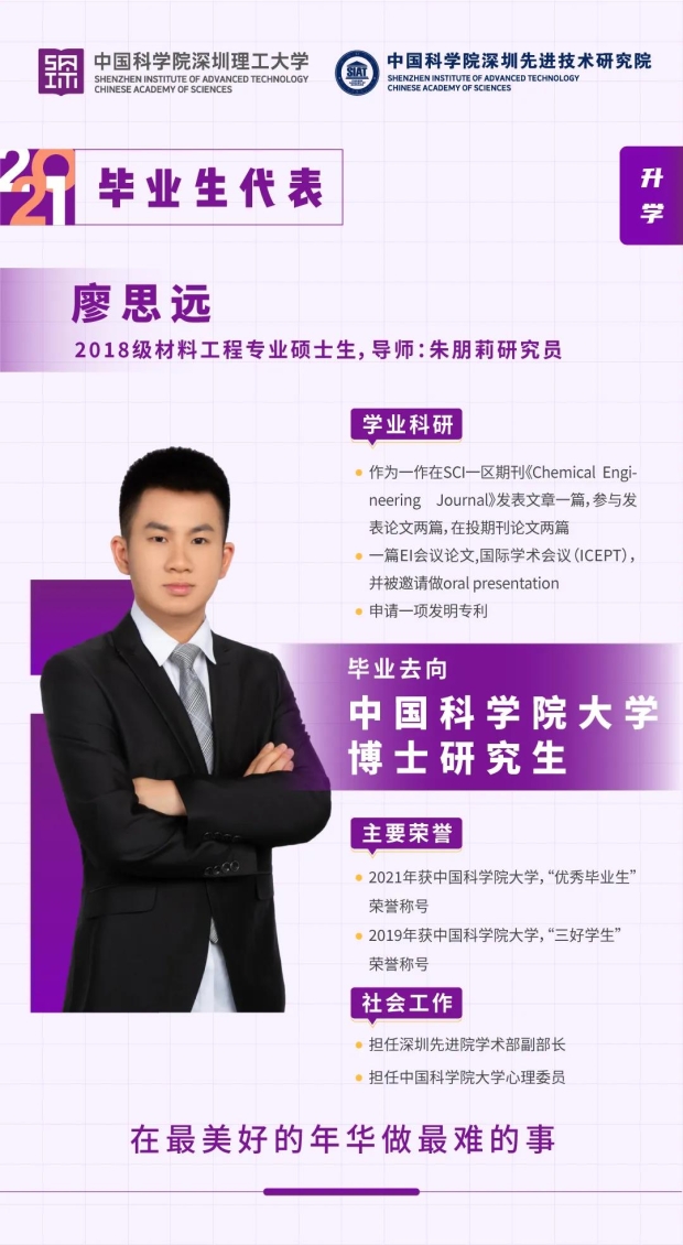 “非学无以广才,非志无以成学”,只有下得苦功夫,才能求得真学问,硕士期间是人生很重要的一个阶段,静下心来好好打磨自己,在毕业的时候无论继续攻读博士或者找工作都很有帮助;深圳先进院的平台很大,能给各位学弟学妹们提供很好的科研条件,以及社交能力锻炼的机会,希望大家能够好好珍惜。