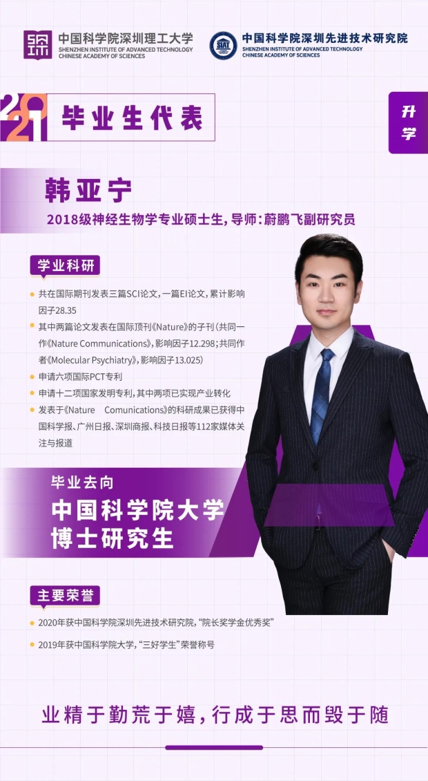 韩亚宁,脑所脑图谱中心的硕士毕业生,导师是蔚鹏飞副研究员,研究方向是计算神经行为学,共在国际期刊发表3篇SCI论文,1篇EI论文,累计影响因子28.35;其中两篇论文发表在国际顶刊Nature的子刊(共同一作Nature Communications,影响因子12.298;共同作者Molecular Psychiatry,影响因子13.025);申请6项国际PCT专利;申请12项国家发明专利,其中两项已实现产业转化;发表于Nature Comunications的科研成果已获得中国科学报、广州日报、深圳商报、科技日报等112家媒体关注与报道。