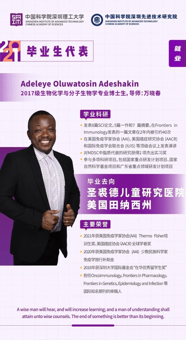 Adeleye Oluwatosin Adeshakin,来自尼日利亚,医药所蛋白与细胞药物研究中心博士生。师从万晓春研究员和鄢德洪副研究员,研究方向为研究新一代可抑制肿瘤微环境中免疫抑制细胞功能的药物。累计发表SCI论文8篇,其中5篇一作。此外,他还发表了7篇摘要。作为博士生,他被推举为《肿瘤免疫学》《药理学前沿》《遗传学前沿》等期刊的审稿人。毕业后,他将赴美国圣裘德儿童研究医院(St. Jude Children's Research Hospital)从事博士后工作,该医院是美国最顶尖的儿童肿瘤医院。
