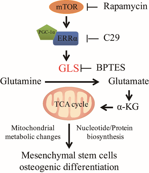 间充质干细胞(MSC)是一类具有自我更新和多向分化潜能的多能干细胞,临床应用潜力巨大。干细胞的分化受到衰老、营养、激素等内外复杂因素的影响,管敏副研究员与研究实习员黄童龄等最新发现能量代谢可能是决定干细胞分化的关键因素之一,研究发现衰老可导致MSC能量代谢失衡,成骨分化能力减弱,引发骨质疏松等代谢性骨病,重要的营养感受因子mTOR通过核受体ERRα调控谷氨酰胺酶(GLS),影响线粒体谷氨酰胺的回补代谢,提供MSC分化所需核酸、蛋白等生物分子合成的能量需求,提高衰老MSC的成骨分化能力。此研究揭示了MSC代谢调控和成骨分化的新分子通路机制mTOR-ERRα-GLS。