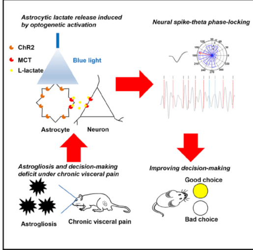 中科院脑智卓越中心、深圳先进院的王立平团队和香港城市大学李婴教授团队经过过去几年的合作攻关,用光遗传技术技术、动物行为学结合活体电生理技术等方法,发现慢性痛大鼠模型中的动物决策认知功能显著下降,其内在神经环路机制在于外侧杏仁核(BLA)-前扣带回(ACC)的神经活动的同步性显著降低。同时光遗传特异性刺激ACC脑区的星型胶质细胞,可以有效提高局部微环路中的乳酸(L-Lactate)的浓度,进而增强了上述两个脑区之间的同步性,有效改善慢性痛对大鼠决策认知能力的影响。