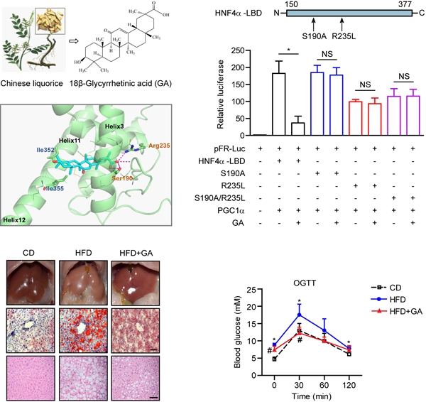 研究采用计算机模拟分子对接技术筛选到核受体HNF4α是18β-甘草次酸的潜在分子作用靶点。通过免疫共沉淀、双荧光素酶报告系统和点突变等分子细胞实验技术证实18β-甘草次酸作为HNF4α的拮抗剂抑制其转录活性,进而调控肝脏糖脂代谢的关键基因表达。肥胖和糖尿病等代谢疾病动物模型的疗效实验揭示18β-甘草次酸明显改善肝脏的糖脂代谢异常,降低血糖血脂、减轻脂肪肝和糖耐受。该研究明确核受体HNF4α是中药单体18β-甘草次酸的药物作用分子靶标,证实18β-甘草次酸改善肝脏糖脂代谢紊乱的功效和作用机制。