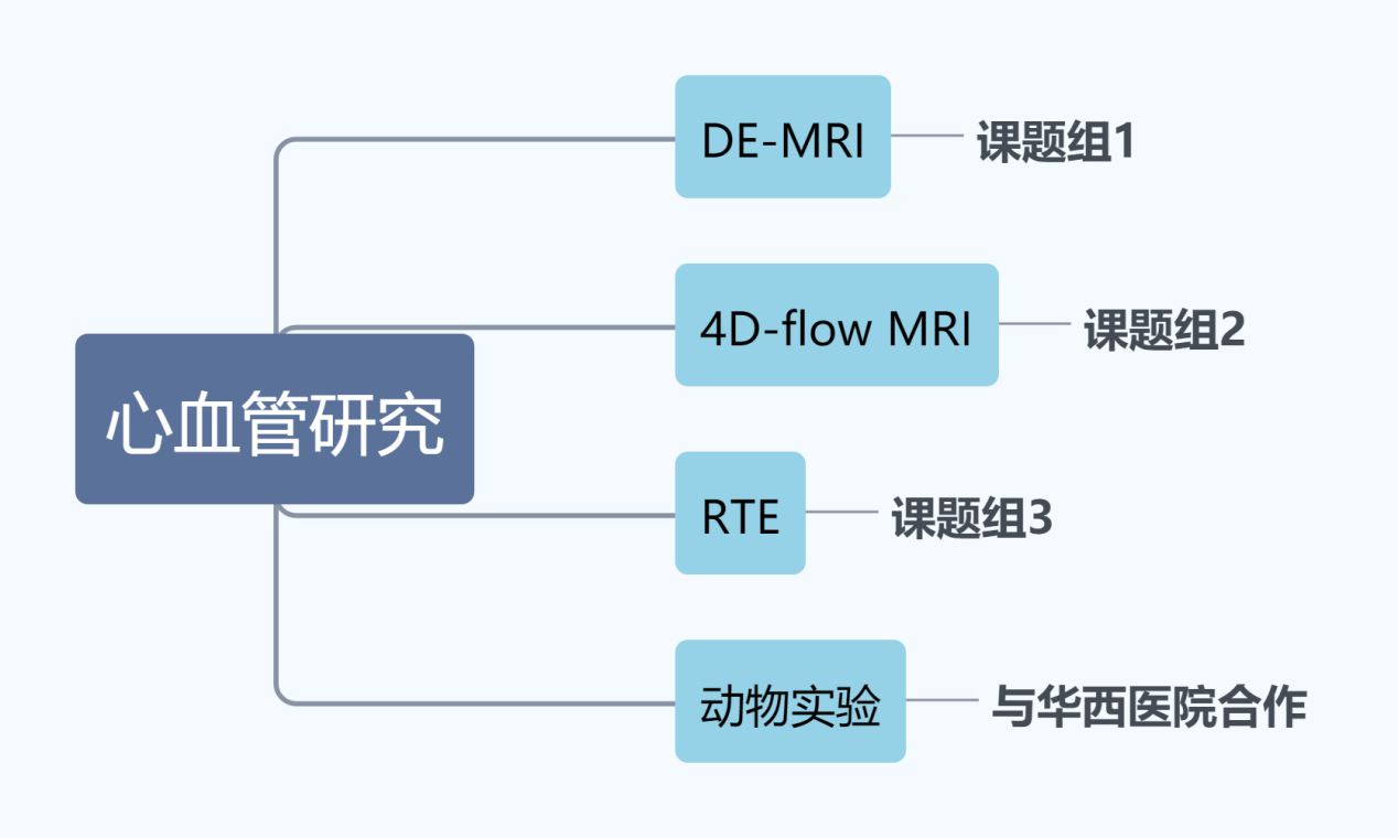 团队主要进行心血管研究,团队下设三个课题组(如图4所示),分别进行DE-MRI技术研究、4D Flow MRI技术研究和RTE技术研究,而动物实验主要通过与华西医院进行合作。每个团队都在国际期刊上发表了顶级杂志的文章,描述了基于4D flow MRI成像的左心房流体力学变化介导的心房结构重构在心房纤颤的发生与发展作用及机制以及基于4D 磁共振和超声弹性成像技术的心房纤维化在心房颤动中的作用及机制。