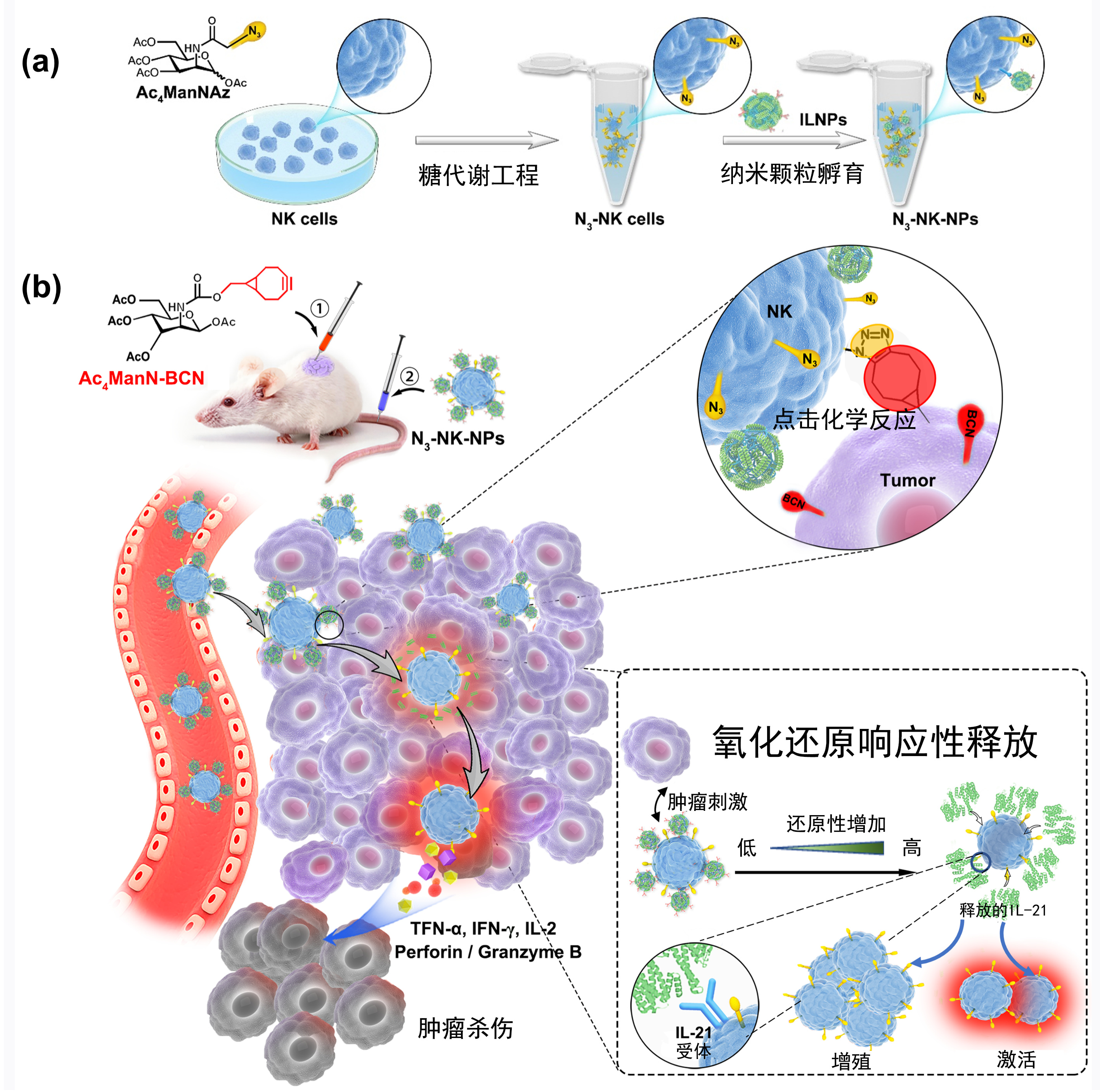 以自然杀伤细胞(NK)为基础的免疫疗法在癌症治疗中具有突出的潜力。然而,其在实体肿瘤中的应用功能迅速下降以及归巢和浸润不足的限制。蔡林涛研究员及李文军副研究员、龚萍研究员团队共同合作基于前期的研究基础(Small, 2019, 15, 1804383;Adv. Sci. 2019, 1900251;Bioactive Materials, 2021, 6, 951–962)提出了一种生物正交靶向的活细胞纳米载体技术。利用在NK细胞表面植入生物正交基团及偶联白介素-21(IL-21)纳米颗粒(ILNPs)实现其对实体瘤的深度浸润及原位激活。