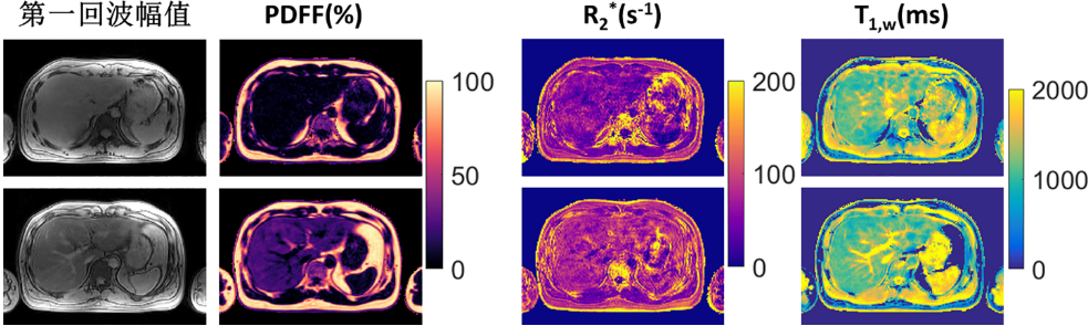 图2:一次屏气内(<12秒)实现全肝脏的脂肪分数PDFF,R2*和wT1的定量成像
