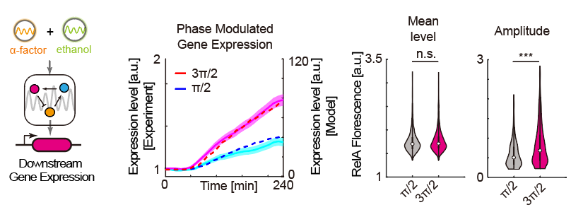 最后,通过引入下游荧光报告基因,作者在实验和模型中确认了这种相位调整带来的振幅变化的确能造成基因表达水平的差异。这种差异与振荡的基线水平、振荡周期均无关。