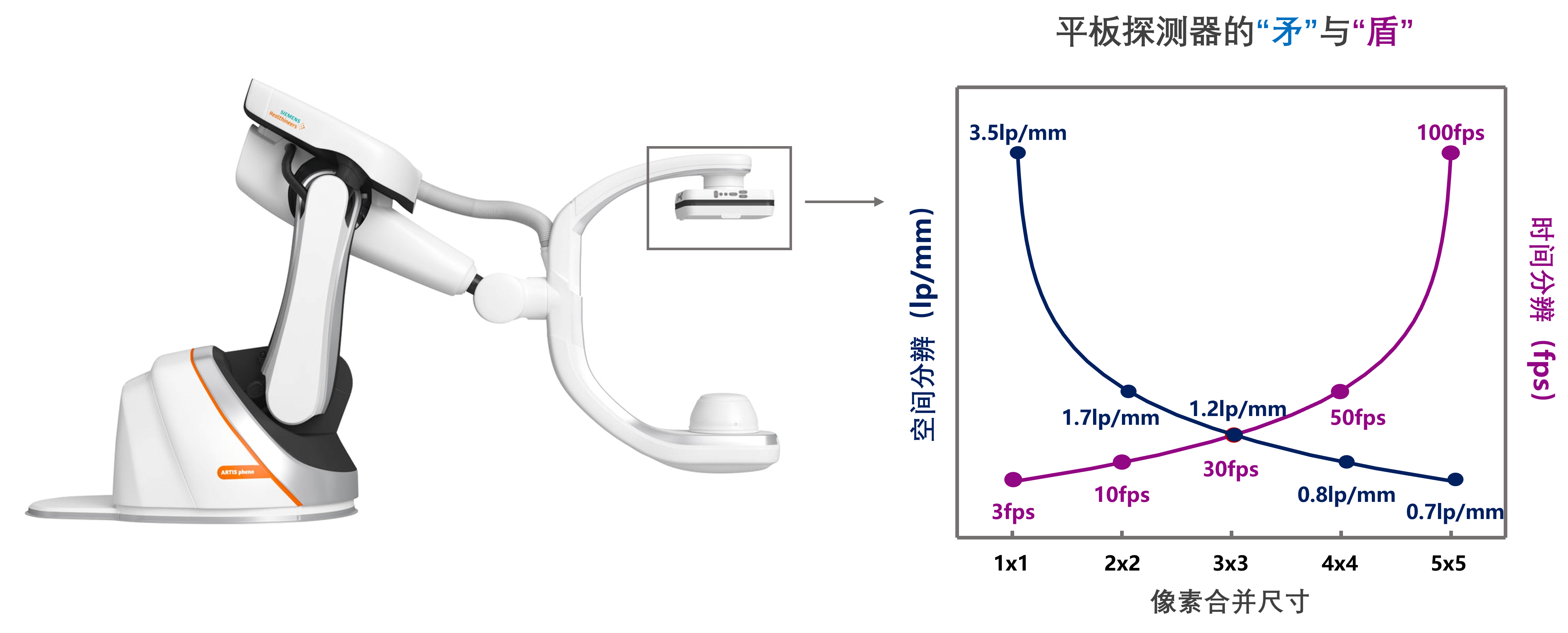 锥束CT因其独特的成像优势和开放的系统结构设计,可以在血管介入治疗、牙科检查、骨科手术、乳腺癌筛查等众多临床诊疗场景中为医生提供实时的三维诊断信息,近年来受到越来越多的关注。然而,传统平板探测器受数据采集方式的制约,导致锥束CT成像系统存在空间分辨与时间分辨无法兼得的内在矛盾(图1)。换句话说,为了追求更高的成像空间分辨率,需要大幅降低锥束CT的成像速度;反之,如果追求更快的成像时间分辨率,则需要损失锥束CT的空间分辨率。长期以来,这一突出矛盾导致锥束CT无法满足临床诊断的发展需求,亟需变革。