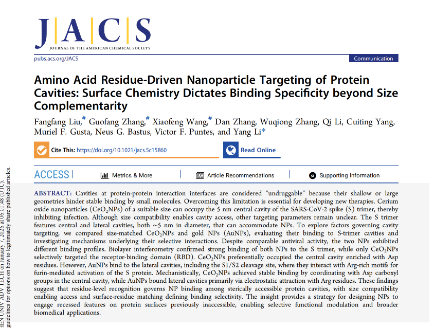 蛋白-蛋白相互作用界面的蛋白表面腔体在细胞信号调控和病毒入侵等过程中具有重要功能,但其结构浅、尺度较大,长期被认为难以通过传统小分子实现稳定靶向,成为限制相关调控策略发展的重要瓶颈。团队此前研究(Nano Today, 2024, 55, 102183)发现,尺寸约为 3 nm 的氧化铈纳米颗粒(CeO₂NPs)能够插入 SARS-CoV-2 刺突蛋白约 5 nm 的中央腔体,为“纳米材料可靶向蛋白表面腔体”这一概念提供了直接实验依据。在此基础上,团队进一步开展了针对腔体选择性靶向机制的系统研究。