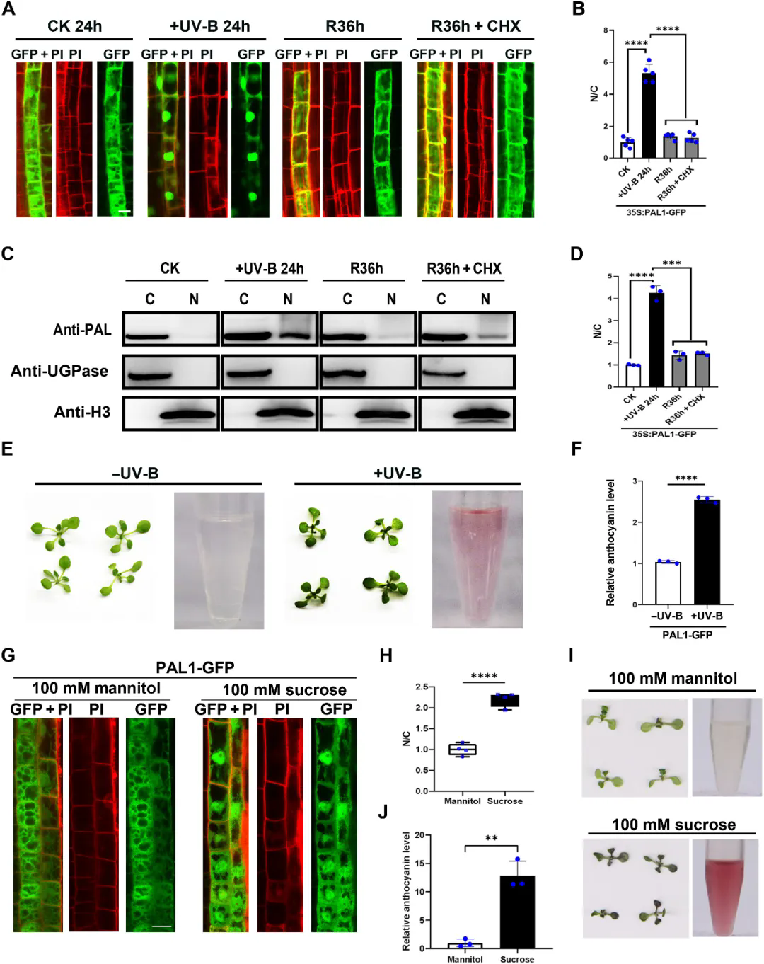 PAL传统上被认为定位于细胞质,而本研究首次证实PAL不仅存在于胞质中,还可显著存在于细胞核中。该核定位具有动态可逆性:在UV-B辐射或高蔗糖处理诱导黄酮生物合成增强时,PAL在细胞核中富集;刺激解除后,其重新分布至胞质。该过程不依赖新蛋白合成,提示PAL通过快速、可逆的亚细胞定位重分配参与代谢调控。
