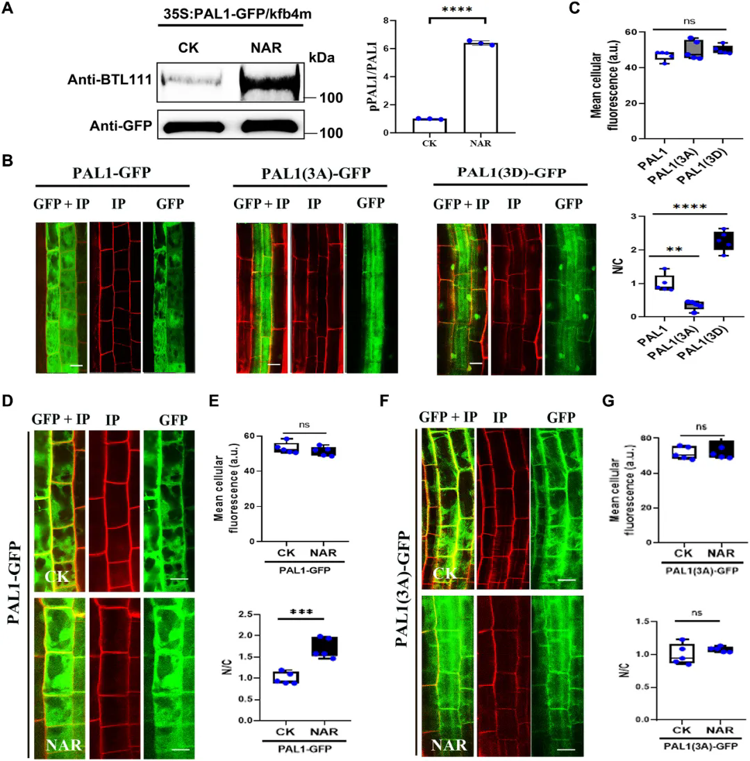 研究进一步发现,黄酮通路中间体Naringenin(NAR)可以诱导PAL发生磷酸化修饰。通过质谱分析,研究团队鉴定出关键磷酸化位点(S152、T153、S163)。当这些位点模拟持续磷酸化时,PAL持续定位于细胞核;当这些位点失去磷酸化能力时,PAL则无法响应NAR进入细胞核。这说明,磷酸化是PAL入核的分子开关。这也提示,植物体内可能存在一个尚未被鉴定的“黄酮信号感受-激酶模块”,负责感知代谢状态并驱动PAL转位。