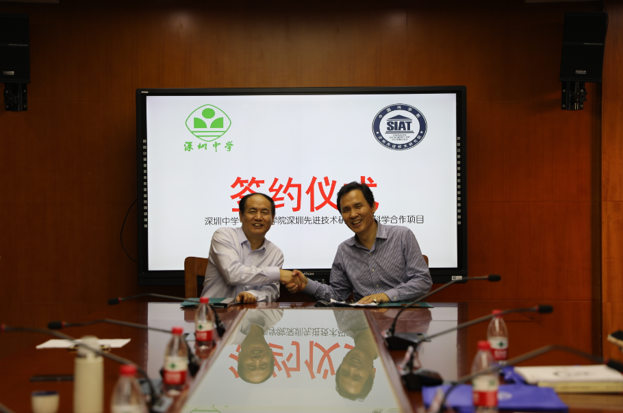 深圳中学校长朱华伟(左)与深圳先进院脑所所长王立平(右)签约