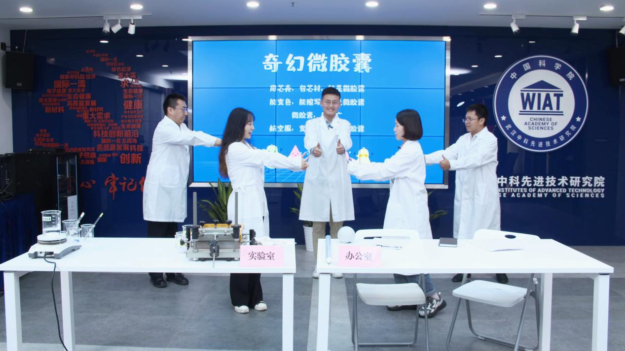 作为湖北省唯一一支入围第四届全国科学实验展演汇演决赛圈的代表队,武汉先进院展演的作品《微胶囊的奇幻世界》通过生动活泼的情景演绎、幽默风趣的科学讲解、严谨精确的中试过程演示,深入浅出地解释了什么是“高大上”的微胶囊技术、感温变色微胶囊的制备方式以及武汉先进院无醛微胶囊的产业化应用等。短短6分钟的展演过程,平时严肃专业的科技工作者演绎出他们有趣灵动的另一面,引得直播平台观众纷纷点赞留言。