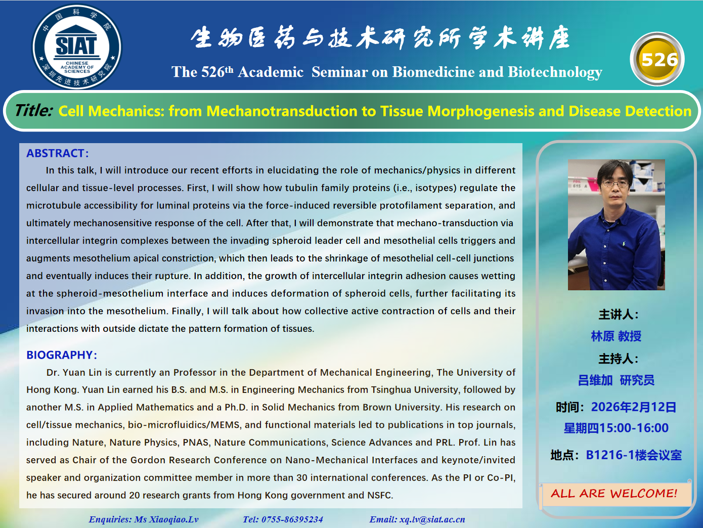 大家好! 医药所第526期学术讲座将于2026年2月12日 星期四 15:00-16:00 B1216-1大会议室举行。本次讲座邀请了来自香港大学 林原 教授带来“Cell Mechanics: from Mechanotransduction to Tissue Morphogenesis and Disease Detection”的报告。届时,吕维加 研究员将主持讲座。