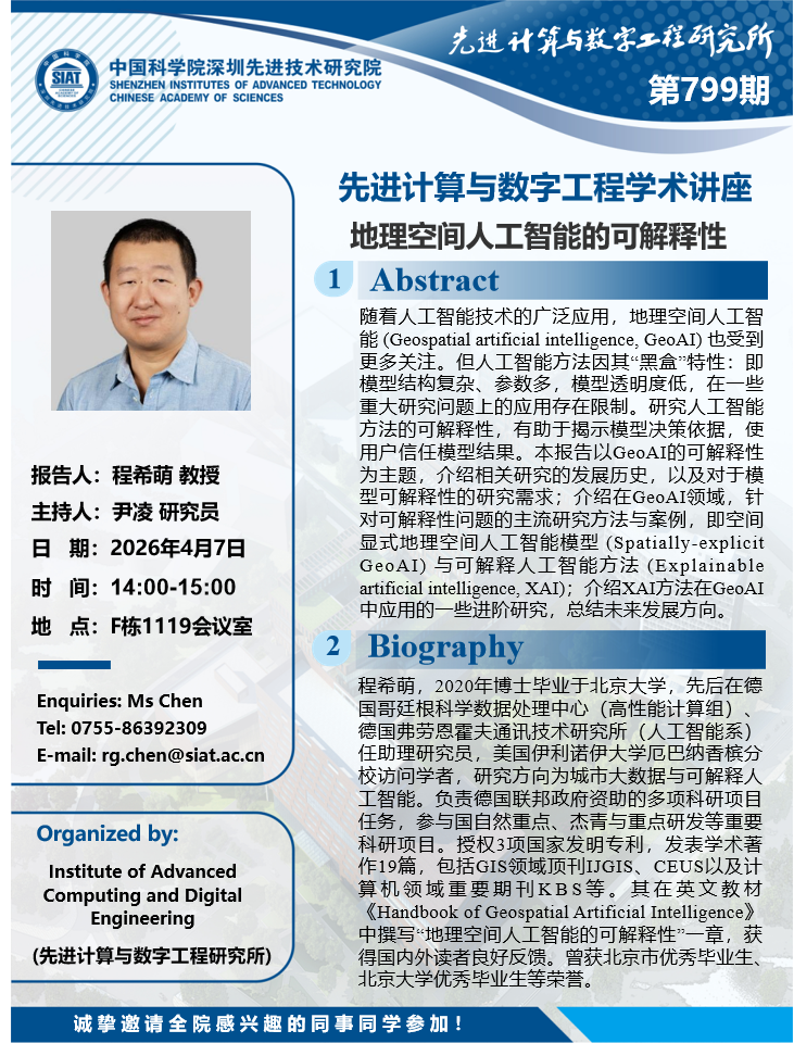 大家好!数字所/计算机学院第799期学术讲座将于4月7日14:00-15:00在F1119会议室举行,本次讲座将邀请德国弗劳恩霍夫通讯技术研究所 程希萌 教授作题为“地理空间人工智能的可解释性”的报告。