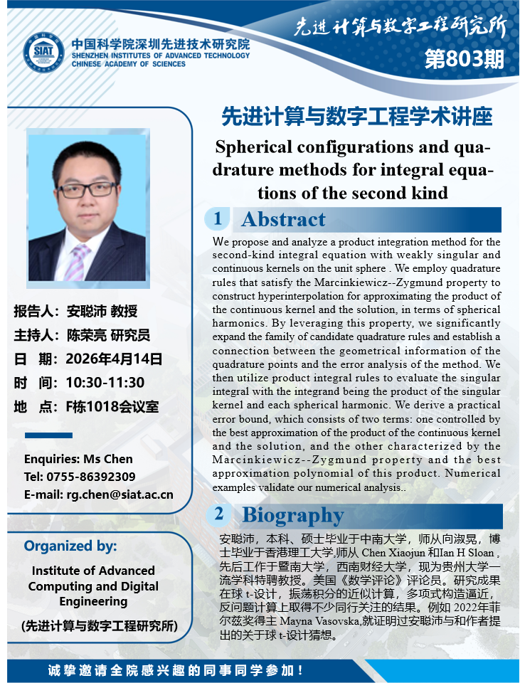 大家好!数字所/计算机学院第803期学术讲座将于4月14日10:30-11:30在F1018会议室举行,本次讲座将邀请贵州大学 安聪沛 教授作题为“Spherical configurations and qua-drature methods for integral equa-tions of the second kind”的报告。